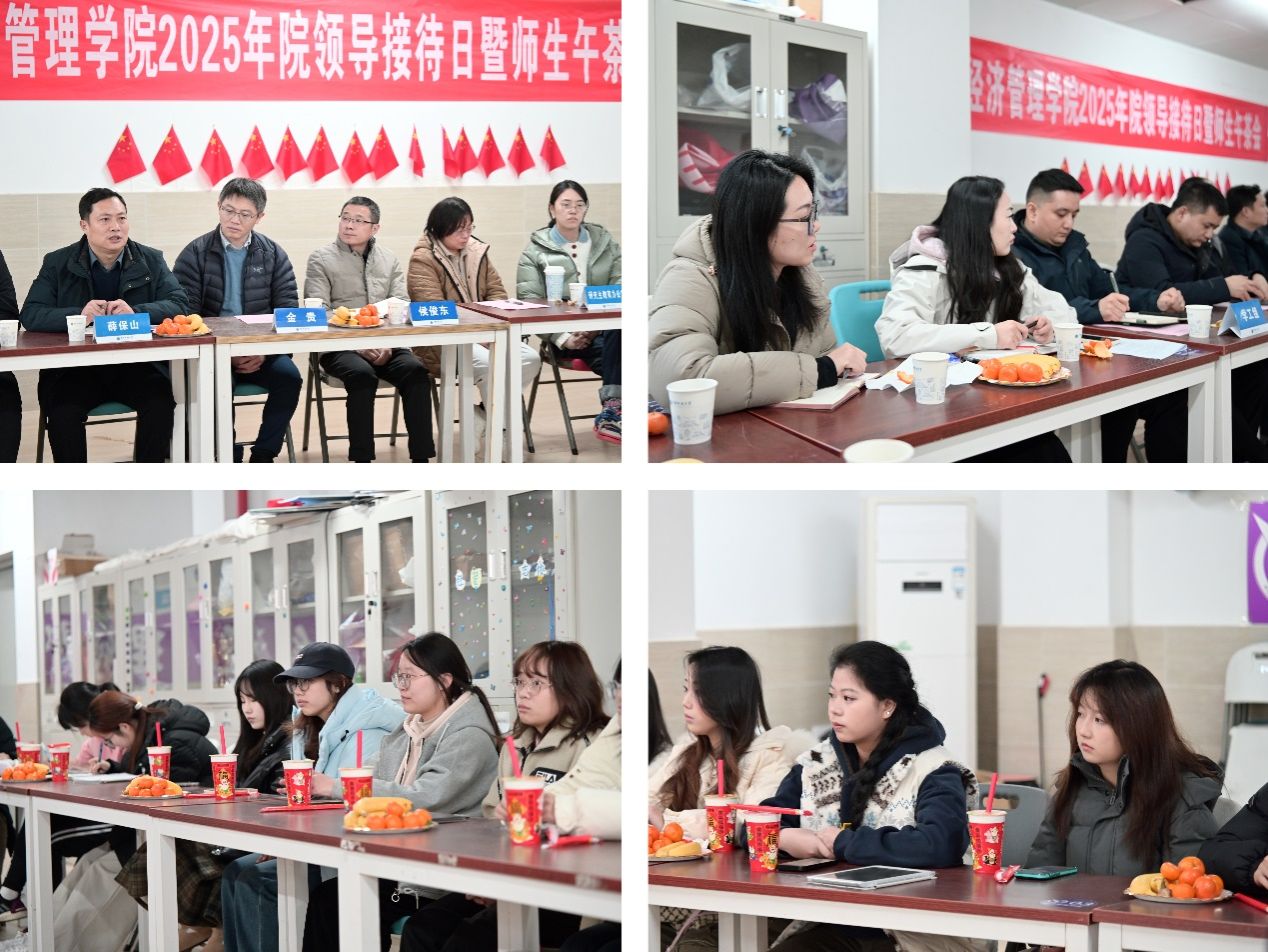 (通讯员:徐媛)为更好畅通师生交流渠道,增强学院师生凝聚力,搭建服务学生成长成才与学院民主办学的平台,12月25日中午,2025年院领导接待日暨师生午茶会在学生宿舍二组团“经鹰驿站”举行。学院党委书记薛保山、副书记李纪亮、副院长金贵、侯俊东、池毛毛出席活动,本科生教育办公室、研究生教育办公室、学工组有关教师及本研学生代表共三十余人参加活动。