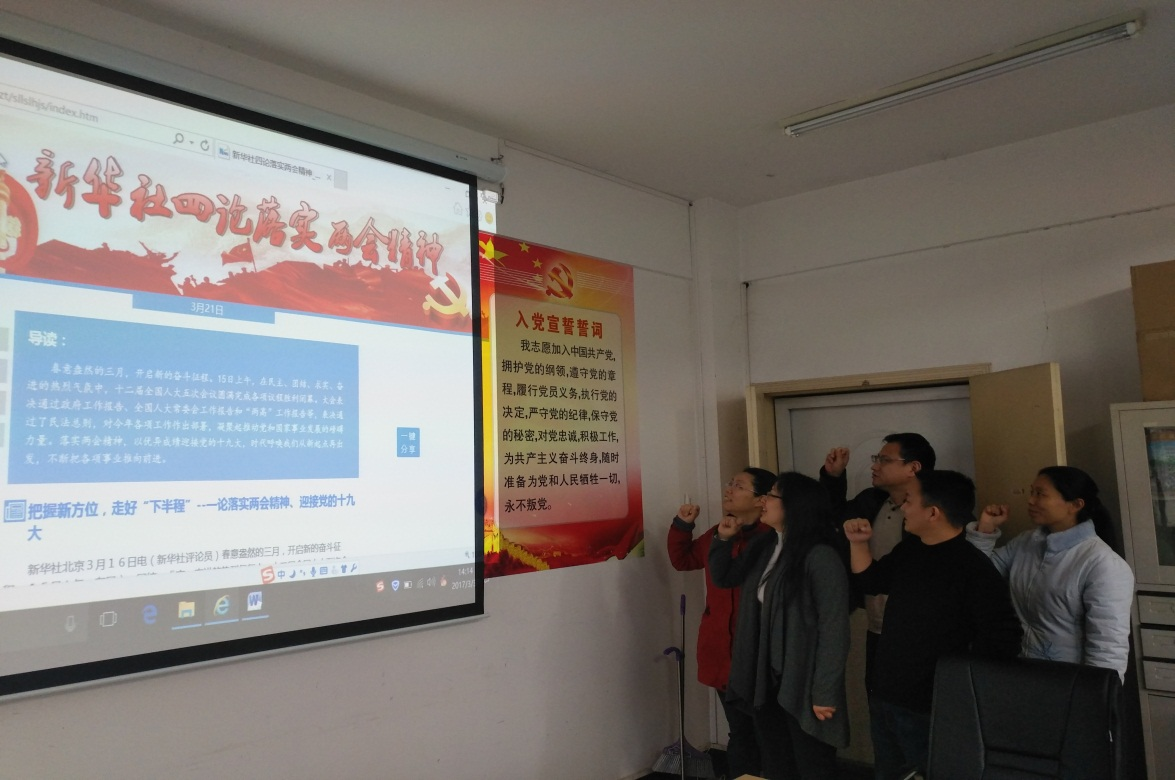 内容:全体党员齐唱国歌、重温入党誓词,集体诵读党章,组织委员报告了本月缴纳党费情况,党员交纳党费。集中学习了“两会”精神、《关于加强和改进新形势下高校思想政治工作的意见》,随后党员同志们结合学校和学院专业特色,就绿色新能源、供给结构侧改革、资源型企业转型等报告中的热点问题展开了热烈的讨论。经过本次支部主题党日的学习,与会的党员教师们一方面更加清楚政府关于2017年经济工作的重点,也认识到新形势下思想政治工作的重要性,学习效果良好。