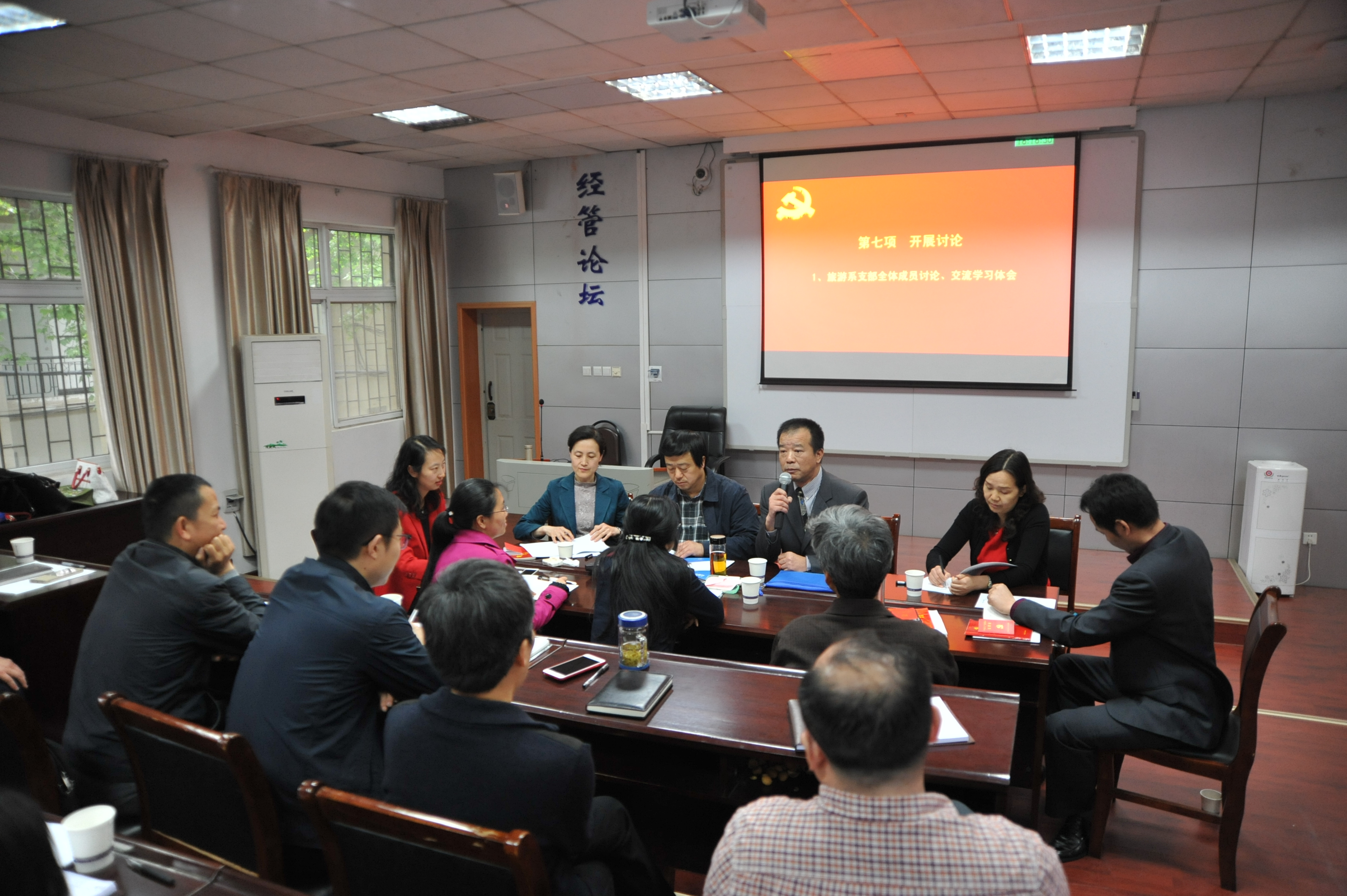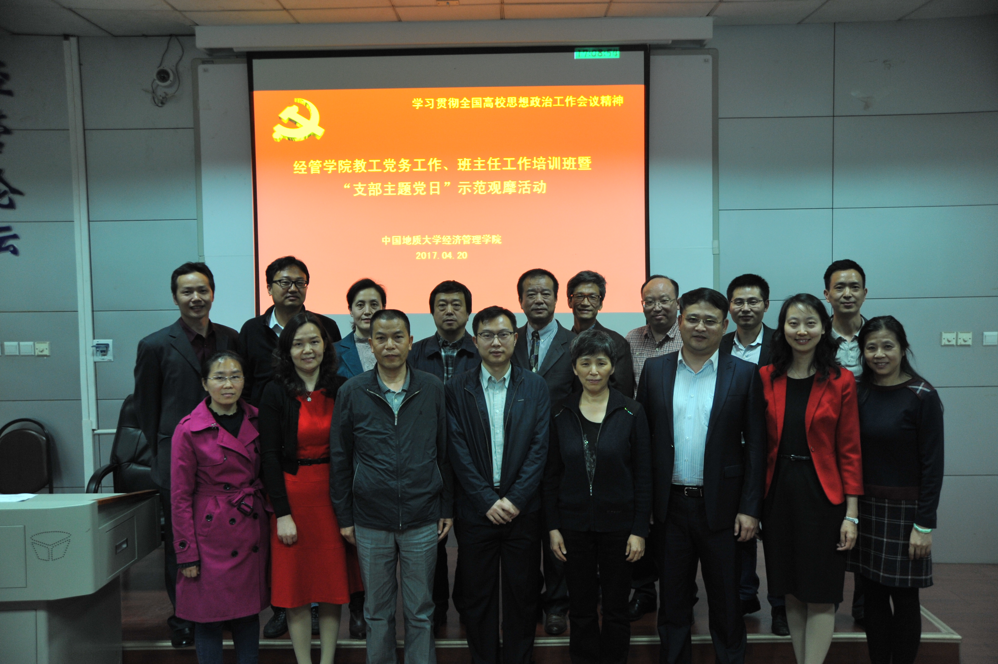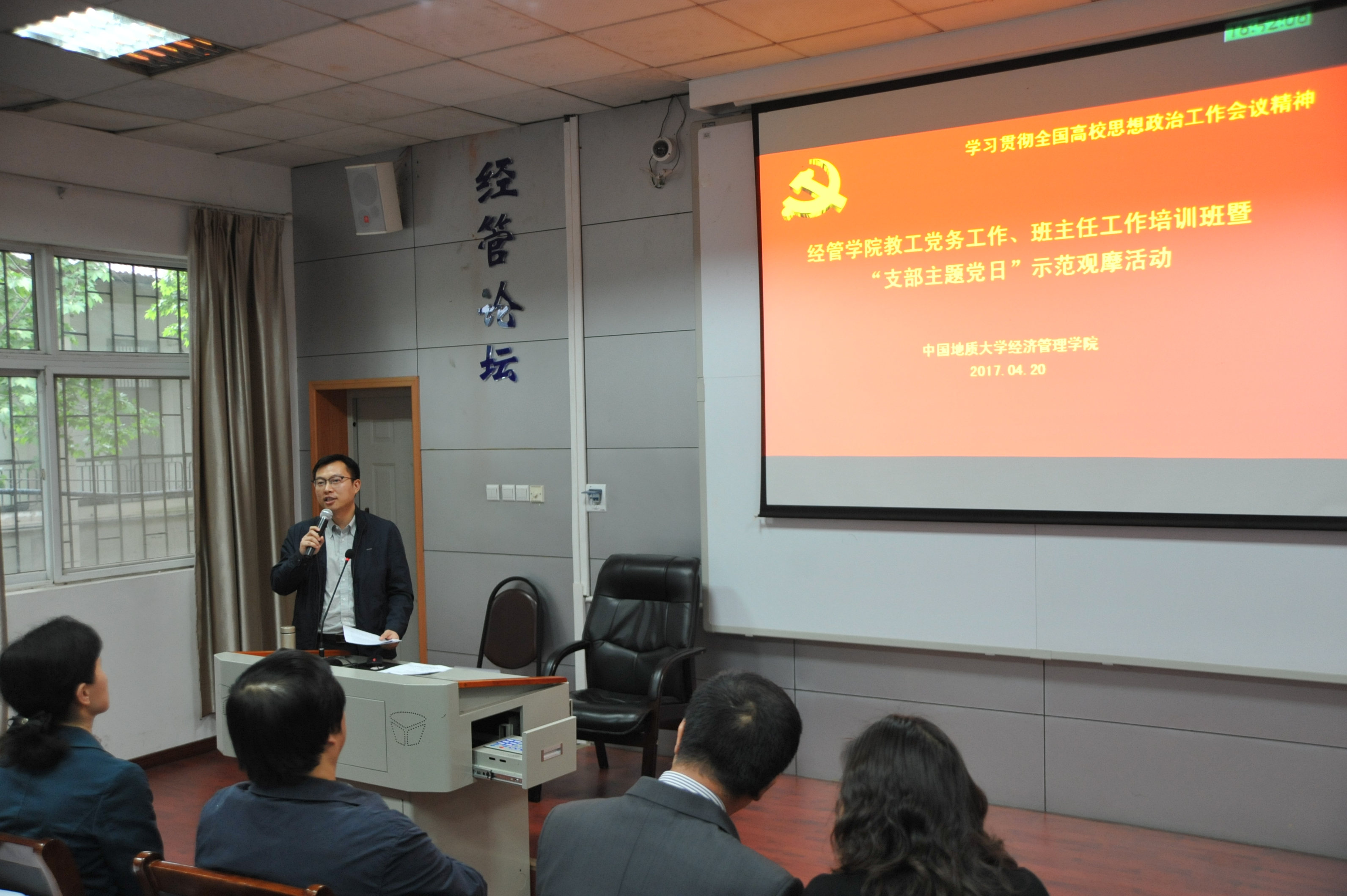 2017年4月20日下午,Beat365唯一官方网站在北三楼208会议室举办了教工党务、班主任工作培训班暨“支部主题党日”示范观摩活动。为推进“两学一做”学习教育常态化、制度化,深入贯彻落实党的十八届六中全会和全国高校思想政治工作会议精神,认真贯彻落实中共中央、国务院《关于加强和改进新形势下高校思想政治工作的意见》精神,结合党支部“支部主题党日”的部署要求,提高“支部主题党日”活动的针对性、实效性,Beat365唯一官方网站党委精心布置并组织了本次培训与观摩活动。出席和参加本次活动的人员有:Beat365唯一官方网站党委委员、纪委委员,各教工党支部委员、全体专职与兼职辅导员、本科班级班主任,以及旅游系教工党支部全体党员。活动由经管学院学院副书记沈波同志主持,校组织部副部长梁本哲同志莅临现场并指导。