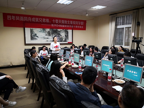 同学们参观新行政楼和逸夫博物馆,感受校园点滴变化,在北区食堂重温昔日校园生活。13日下午3:30—5:30,师生们在北四楼104会议室召开了具有特殊意义的班会活动。同学们饱含对母校的深情,回顾了大学四年专心求学的艰苦历程,重温了老师们的谆谆教导和同学间相互帮助的深情厚谊;分享了毕业十年来的工作经历与感悟。肖建忠副院长代表学院欢迎同学们返校交流,介绍了经管学院与国贸系近十年来的蓬勃发展情况,寄语同学们不忘初心,砥砺前行,展我地大学子艰苦朴素、求真务实之风;倪琳、吴磊与易杏花等老师也深情回忆了遥远而熟悉的青葱岁月,为同学们的成就感到由衷高兴与自豪,祝愿大家路越走越宽广,欢迎大家常回母校看看。
