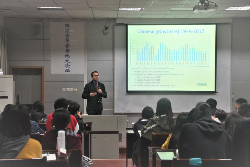 讲座开始前,肖院长代表学院对Andrew Farlow 研究员的到来表示欢迎。Andrew Farlow研究员为大家带来讲座:中国与世界经济。他讲到,当前全球经济正处于动荡之中,金融、经济、政治和社会都存在不稳定的风险,而本次讲座探讨了金融危机前后采取的经济模式和政策中出现的问题以及到现在仍然存在的问题。Andrew Farlow研究员分析了美国、中国、俄罗斯、欧盟(特别是英国脱欧之后)和新兴经济体的当代形势,同时他还研究世界贸易,全球化和保护主义不断变化的形态,并讨论政策制定者应如何应对以上情况。老师和同学们认真学习,获益匪浅。