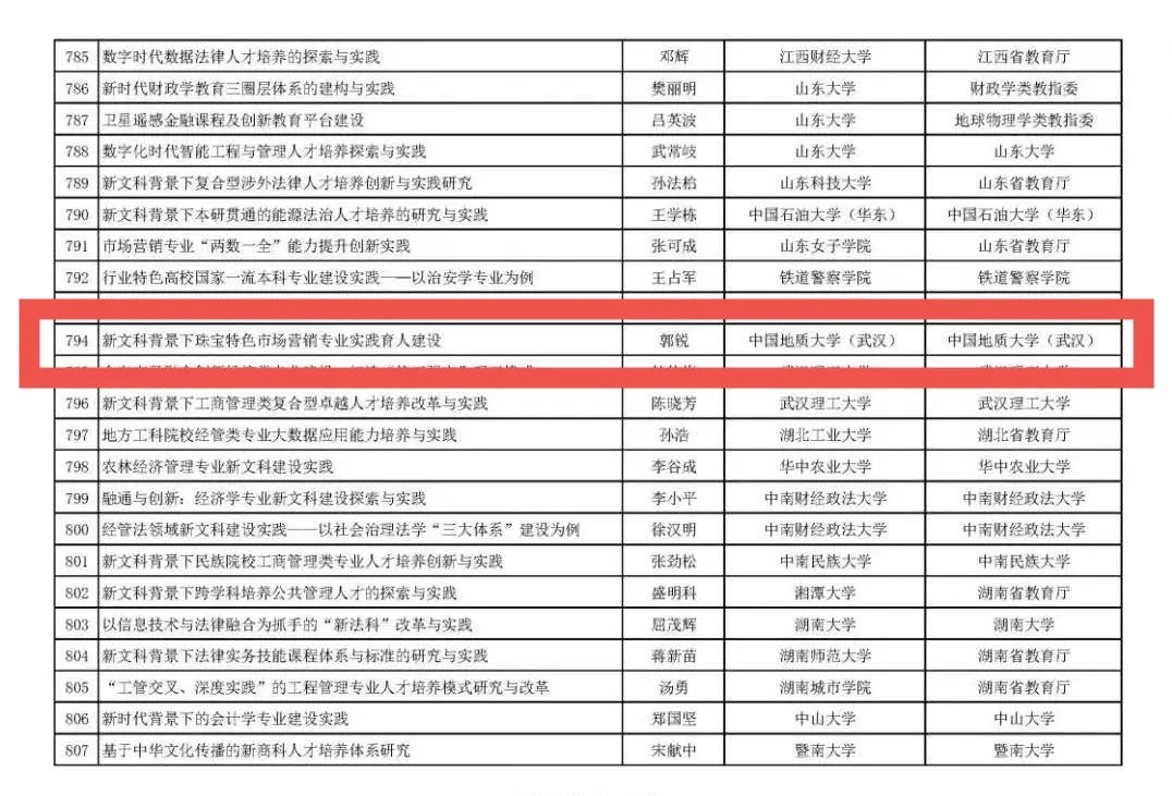 近日,教育部公示首批国家级新文科研究与改革实践项目拟立项项目1012个,Beat365唯一官方网站郭锐教授的“新文科背景下珠宝特色市场营销专业实践育人建设”项目成功立项!