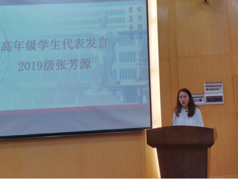 典礼第四项,2019级本科生代表张芳源发言。她作为“过来人”,向新生分享了三点建议。第一,立足自身,做好规划。希望大家能够树立明确的目标,合理规划大学生活。第二,严于律己,以学业为本,时刻保持刻苦自律的精神,脚踏实地的完成学业;第三,拓宽视野,勇于尝试,学会思考,提升自我,不可“躺平”。