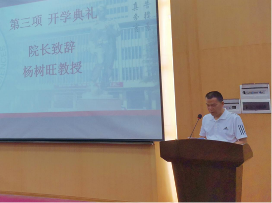 典礼第一项,院长杨树旺教授致辞。杨院长首先对438多名新生的到来表示热烈欢迎,随后从学科建设、专业设置、人才培养体系等方面介绍了学院概况,并对新生提出了三点期望。一是希望大家热爱祖国,勇担时代重任;二是学会在思考中学习,在批判中学习,能有所思并有所得;三是拥有健全的人格,做到五育并举。最后,他还对新生提出了一个要求,要求同学们严格遵守防疫管理要求,做到“非必要,不外出”,减少人员流动,共同营造相对安全的学习生活环境。