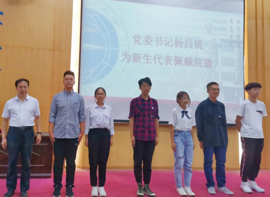 典礼第六项,院党委书记杨昌锐为新生代表佩戴院徽。