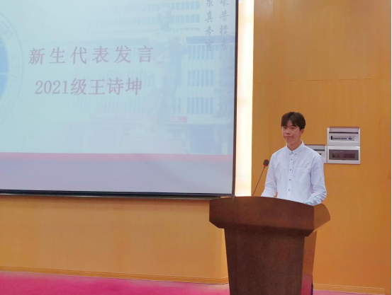 典礼第五项,2021级新生代表王诗坤发言。他表示,学习之路漫长坎坷,仍需不断学习,以充实自己的精神境界;同时,以激昂的姿态面对一切困难和挑战,时刻谨记“艰苦朴素,求真务实”的校训精神,秉承“宽信敏公,经国济民”的院训精神,在地大绽放出最青春的力量!