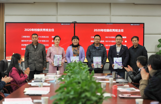 党委书记杨昌锐、院长杨树旺为2020年校级优秀班主任宋莉萍、王腾、梁玥琳、李龙锡老师颁发纪念品。