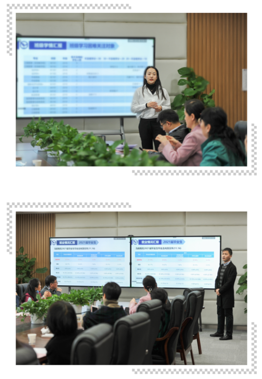 徐媛老师首先汇报学院学生学习情况和学风建设情况。近年来,学院坚持打造“严在经管”品牌,学院学风建设卓有成效,学生学习成绩大幅提高,迈入绩点“3.0+”时代。徐老师向班主任老师对班级学风建设的付出表示感谢,指出在接下来的工作中要继续关注高不及格学分学生的学业状态和心理压力。接下来,张弛老师通报了2021届和2022届毕业生班级就业情况,并根据实现充分就业、高质量就业的目标,结合目前各班开展工作的具体情况,提出了工作建议。