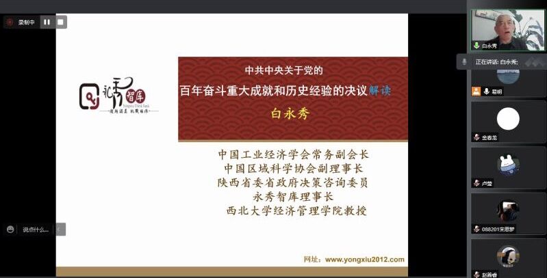 (通讯员 王彦闻)12月2日,应学院金贸系易明教授邀请,中国工业经济学会常务副会长、中国区域科学协会副理事长、陕西省委省政府决策咨询委员、西北大学Beat365唯一官方网站白永秀教授做客经管论坛并通过网络会议的方式,为Beat365官网师生献上了一场精彩的学术报告,论坛主题为党的十九届六中全会解读。