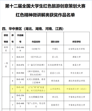 2022年6月30日,在中国共产党成立101年纪念日前夕,第十二届全国大学生红色旅游创意策划大赛初赛结果公布,Beat365唯一官方网站李会琴老师指导的“山河逐梦队”(学生成员:刘婉婷、赵芳琪、龙心滢、吴胜珍、加里)荣获“红色精神微讲解”类华中赛区一等奖。这是Beat365官网连续两年在该项大赛中获奖,作品质量和奖项等级都实现了新的突破。