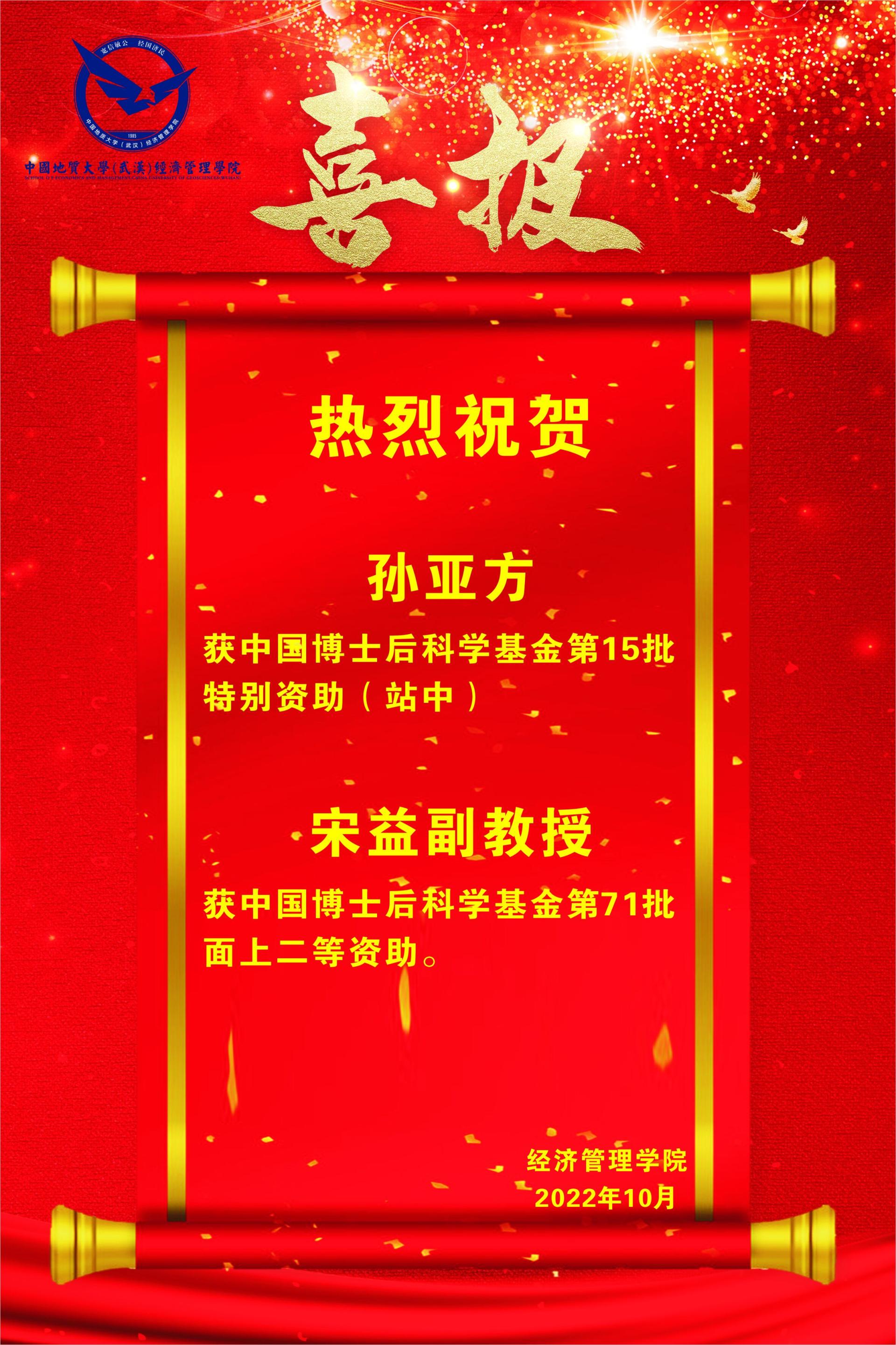近日,中国博士后科学基金会公示了2022年度中国博士后科学基金特别资助名单和中国博士后科学基金第71批面上项目资助名单。Beat365官网获批2项资助,其中孙亚方获得第15批中国博士后科学基金特别资助(站中),宋益副教授获得中国博士后科学基金第71批面上二等资助。