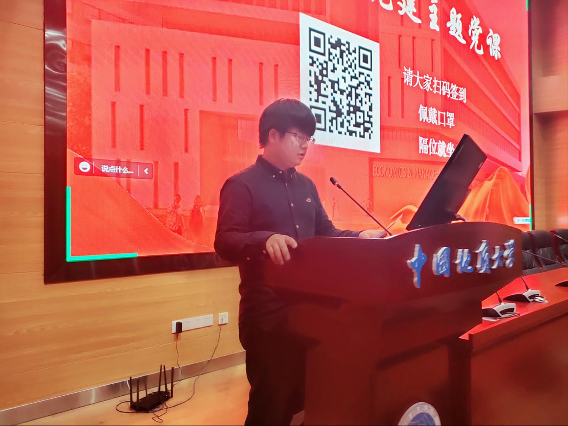 会议最后,学生党建工作辅导员蔡杨老师对会议内容进行了总结,并表示希望经管学生党员深化党员意识、珍视党员身份、恪守党员义务。最后,蔡杨老师带领全体经管学生党员深刻理解学院文化,重温院训院风精神内涵,教育经管学生党员牢记校训院训教诲,做到终身不褪“地大经管本色”。