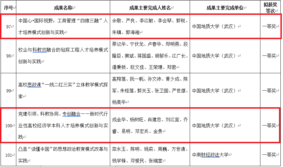 湖北省教学成果奖每四年评选一次,是对我省教育教学改革、人才培养等方面取得成果的检阅和展示,获奖成果代表了我省当前教育教学理论研究与实践探索的最高水平和重大进展。教学成果奖不仅是一项荣誉,更是彰显高等学校整体教育教学水平和学科综合实力的核心指标。根据《湖北省教学成果奖励办法》《省人力资源和社会保障厅省教育厅关于做好第九届湖北省高等学校教学成果奖励工作的通知》(鄂人社奖〔2021〕80号)精神,经各申报单位逐级审核并推荐申报,第九届湖北省高等学校教学成果奖评审委员会对各单位推荐申报的教学成果进行评审,确定600项成果为第九届湖北省高等学校教学成果奖名单,特等奖48项,一等奖152项,二等奖200项,三等奖200项。其中,我校获得特等奖3项,一等奖6项,二等奖9项,三等奖5项。