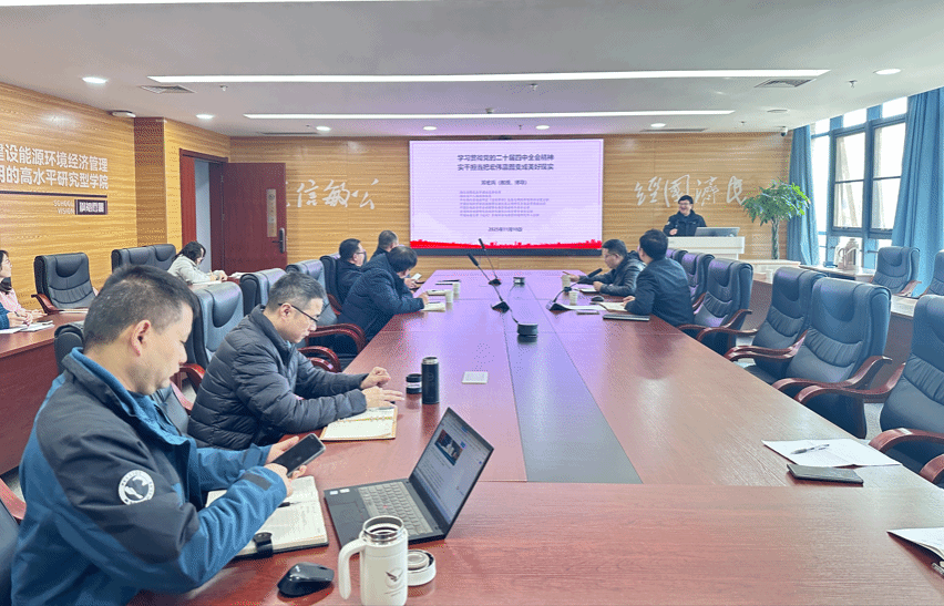 薛保山书记结合学校《关于做好党的二十届四中全会精神学习宣传的通知》就学院贯彻落实全会精神提出三点要求:一是强化理论武装,将全会精神纳入支部"三会一课"和师生政治理论学习重点,组织相关经济管理教授开展宣讲阐释,全院教师要主动将四中全会精神融入教育教学中;二是系统总结谋划,全面梳理"十四五"期间学院建设成果,聚焦中心凝练特色;三是科学编制规划,以全会精神为指引,结合湖北区域发展需求,在能源矿产、资源环境、数字经济、绿色金融等领域打造学科优势,以实干实绩为教育强国建设贡献经管力量。
