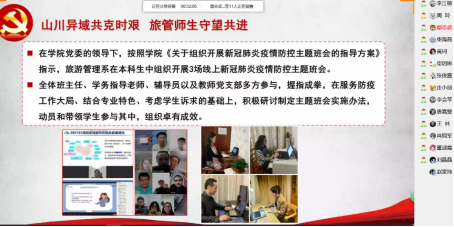 旅游管理系的抗疫主题系列班会以《山川异域共克时艰,旅游管理师生守望共进》为题作了宣传报道,旅游管理系党支部同学院学生工作组联手,共同策划组织开展疫情期间的学生思政教育的这一做法,获得了校学工主管领导的充分肯定,并作为示范向全校推广。