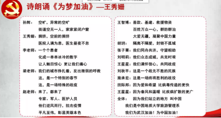在085181班的班会中,由学生王秀珊创作、师生连线共同进行的诗朗诵《为梦加油》在四面八方回响,展现出旅游师生守望共进的担当。