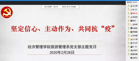 2020年2月28日下午,根据校党委的要求和安排,旅游管理系党支部以QQ电话会议的形式开展了以抗疫为主题的支部主题党日活动,以“坚定信心、主动作为、共同抗‘疫’”为主题,在支部书记李江敏老师的主持下,从学习文件精神、学习先进事迹、支持防控工作等三个方面展开。