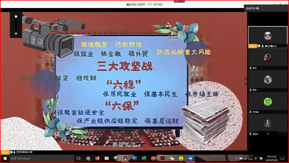 “六保”和“六稳”是党和国家面对前所未有的风险挑战,作出的科学研判和战略部署,体现出我国直面困难推动经济社会发展的决心和信心。信息管理与信息系统专业本科生党支部董文虎同志谈到,“作为2017级学生,从学习两会精神中我感到,党和国家把保就业、稳民生作为重中之重,为毕业生提供不断线的就业服务和保障,这使我对即将到来的2020年秋招更加充满信心。” 2018级管理班硕士研究生党支部夏文丽同志则表示,“今年四月份高校之间的结对帮扶,国家、湖北省以及学校对于学生招聘就业的大力支持和一系列网上招聘活动,无不体现着国家在保就业上作出的努力。相信在党和政府政策的积极引导下,在全国人民的共同努力下,我们必将战胜这次疫情。”