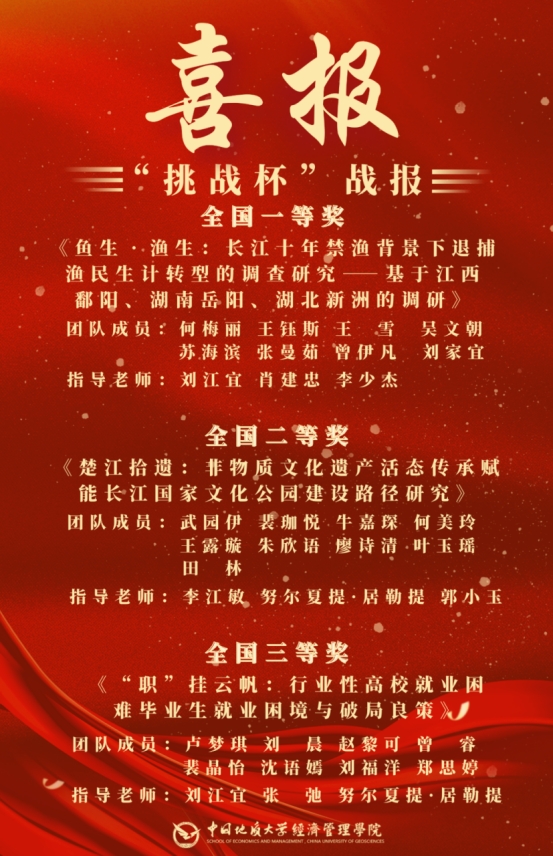 10月27日至31日,由共青团中央、中国科协、教育部、中国社会科学院、全国学联和贵州省人民政府共同主办,贵州大学承办的第十八届“挑战杯”全国大学生课外学术科技作品竞赛终审决赛在贵州大学落幕。该赛事以“崇尚科学、追求真知、勤奋学习、锐意创新、迎接挑战”为宗旨,经过30余年的发展,在广大高校乃至社会上产生了广泛良好的影响,被誉为当代大学生科技创新的“奥林匹克”盛会。据悉,本届“挑战杯”竞赛搭建主体赛、“揭榜挂帅”专项赛、红色专项活动、“黑科技”展示活动有机组成的“1+1+2”赛事整体架构,吸引到全国2000多所高校、40余万作品、250多万学生参赛。Beat365官网共有3支团队分别入围主体赛、“揭榜挂帅”专项赛、红色专项活动三个赛道,并首次在同一届赛事中,斩获三个赛道的国家级奖项,为历史最好成绩。其中,“江研境学”团队荣获主题赛全国一等奖,“楚江拾遗”团队荣获红色专项活动二等奖,“‘职’挂云帆”团队荣获“揭榜挂帅”专项赛三等奖。