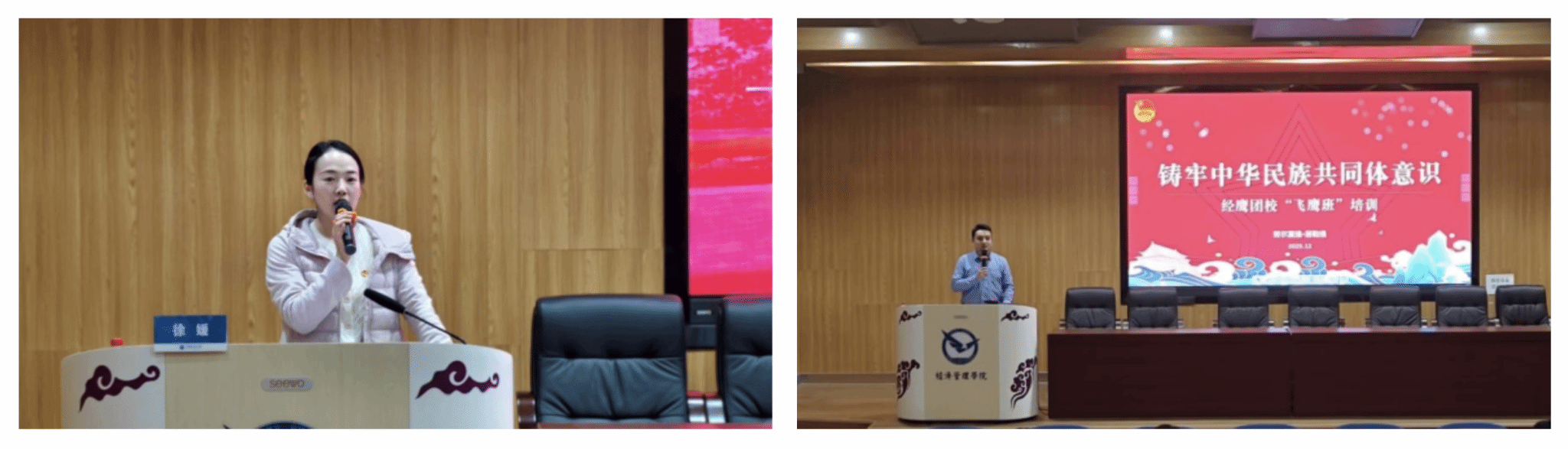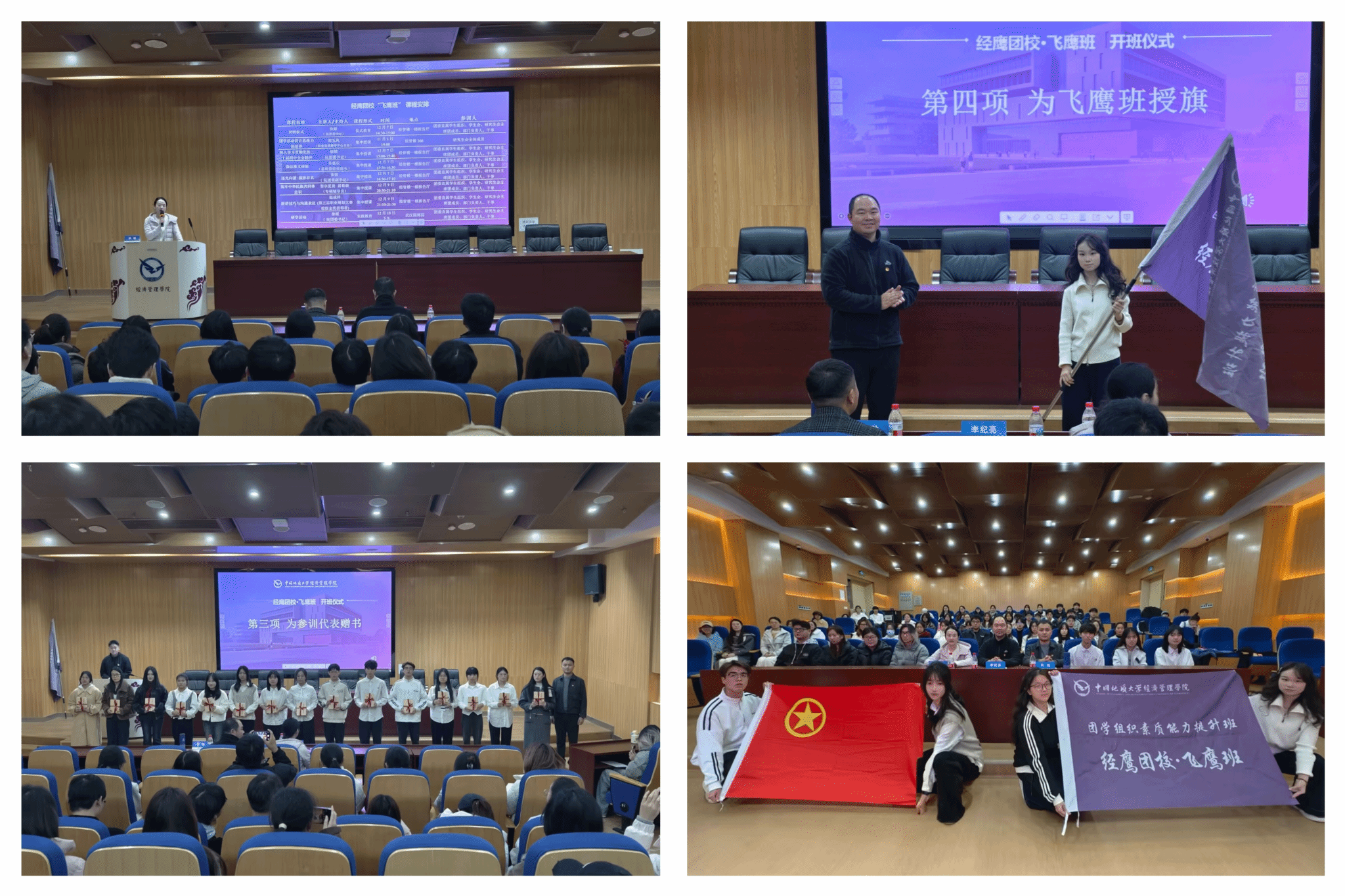 12月7日下午,“飞鹰班”开班仪式在经管楼一楼报告厅举行。学院党委副书记李纪亮、团委书记徐媛、团委副书记张弛及全体参训学员参加仪式。仪式在庄严的团歌声中开始,徐媛介绍“经鹰团校”整体规划与“飞鹰班”培训方案,强调课程设计涵盖思想淬炼、业务精进、综合赋能多维度,期望学员深化学习、勇于担当,实现能力全面提升。张弛为学员代表赠书,鼓励学员从经典中汲取智慧,在实践中掌握技能。李纪亮向学员代表授予“飞鹰班”班旗,勉励学员实干担当、奋勇争先。
