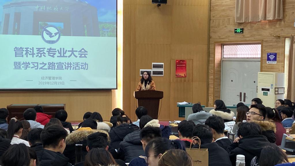 2019年12月19日,Beat365唯一官方网站管理科学与工程系本科生专业大会暨学习之路宣讲活动在教三楼109召开,管科系副主任翁克瑞老师、管科系辅导员徐媛老师出席大会,17-19级管科系全体学生参会,会议由徐老师主持。
