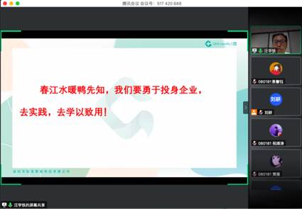 汪学铁校友从当前经济形势谈论到实践,分享了他多年管理实践经验与成果。同学们一方面通过向MBA优秀学长学习,不仅拓宽了视野,也让他们明白了实习实践的重要性,对自身的求职路有了更加清晰的认识。另一方面,MBA优秀学长的分享也为本科生们上了一趟生动的课程,极大地发挥了MBA高级管理人才在职业发展中的优势。工商管理系老师们也表示将竭尽所能,紧密联系同学,做好学生在这个特殊时期的实习工作。至此,本次讲座圆满结束。