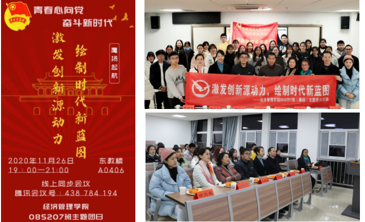(通讯员:静思琪)天气转凉,凛冬已至,可同学们爱团爱国之心不减,创新创业热情高涨。为进一步点亮青春梦想,激发创新源动力,更为引领大家未来四年的学习方向,规划大学学习生活,绘制未来人生广阔蓝图,08S207班团支部协同班委成员,借助学校开展第五届“青春心向党,奋斗新时代”主题团日策划大赛,策划并组织了以“激发创新源动力,绘制时代新蓝图”为主题的主题团日活动。活动策划在“结对领航”教工党支部旅游管理系党支部的指导和支持下进行,并于2020年11月26日晚在南望山校区东教楼A0406教室以主题团课的形式举行。