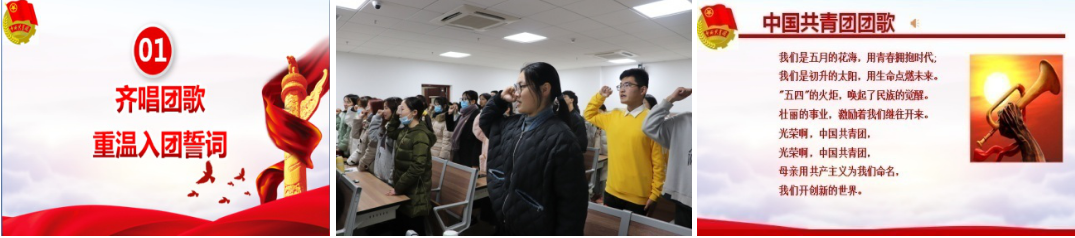 活动在富有青春激情和梦想的团歌凑唱中开始。随后,全体团员同学在团支书王子钰同学的带领下庄严重温入团誓词。
