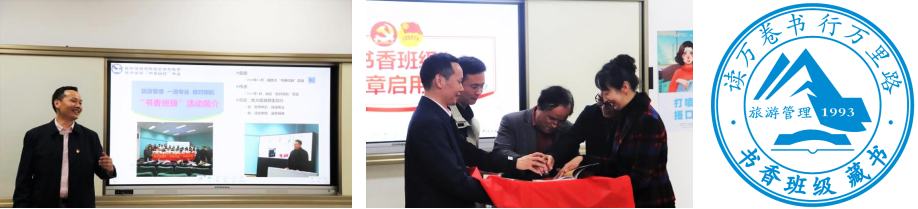 左:旅游管理系系主任介绍“书香班级”活动建设 中:嘉宾为旅游管理“书香班级”启用藏书章