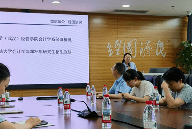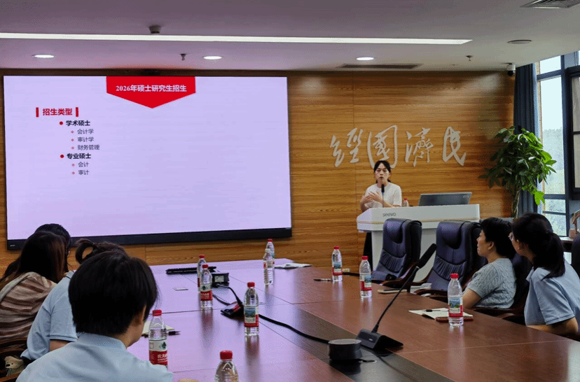 随后,活动进入院校宣讲环节。中南财经政法大学会计学院专硕导师组组长季华教授首先进行宣讲,他通过详实的数据和图表,全面介绍了该校会计学院的办学特色、学科优势以及师资力量,并重点分析了近三年硕士研究生招生的总体趋势、报录比变化等关键信息。紧接着,该院专硕中心办公室主任张昭妍老师就2026年硕士研究生招生政策作了专题解读。张主任从招生规模、考核方式、培养特色等维度,系统阐述了最新招生政策要点,特别提醒同学们关注政策调整带来的新变化。两位专家的宣讲既有宏观政策解读,又包含具体报考建议,为同学们提供了权威的招生资讯。